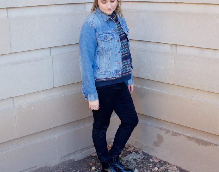 If I could choose one word to describe my personal style, it is eclectic. My style is constantly changing; some days I’m rocking some comfy athleisure, some days it looks like I stepped out of a bohemian paradise and other days it looks like I should be in the woods. I gather the pieces in my wardrobe from a wide variety of places and the outfit I have on in this look illustrates it perfectly. To begin, my denim jacket is from Urban Outfitters. I love the oversized, worn in, ’90s feel. To keep me warm on this chilly day, I wore this patterned sweater underneath. I thrifted it from my local Salvation Army but it is originally from Eddie Bauer. Any striped or patterned sweater would look awesome in this look and would give it great texture. For bottoms, I just wore some simple black pants and threw on my Dr. Martens to give it a slightly edgy feel.