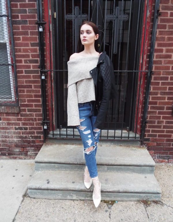 Over the past six months, my wardrobe has slowly become full of business casual clothes, so I take full advantage of any time when I am able to style myself any way I like. On a day to day basis, I go to class in typical black leggings and some sort of sweatshirt or “srat” T-shirt, including my beloved woolly thread. But on trips to the city or a night out to dinner, I especially love a good sweater, as I am wearing here, and one of my numerous pairs booties or lace-up flats in the winter. I consider myself to be an extremely girly person, but sometimes I like to wear an ultra ripped pair of jeans or a (vegan) leather jacket, or even both!