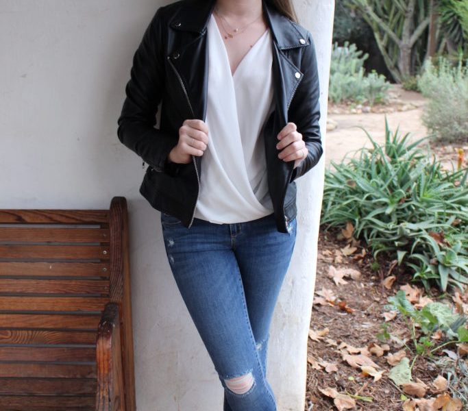 The outfit I am wearing in the photos above is one of my favorite combinations of basics and trends. I pair the perfect ripped blue jeans with everyone’s favorite shoe trend, booties. Booties are my go-to shoe when I want to add a little bit more to an outfit. I have always felt that I could do anything when I have on the perfect shoe. I wore a sleek white blouse and finished off the whole look with a leather jacket. To add a little sparkle to the outfit, I paired some of my favorite Kendra Scott earrings and my every day dainty necklaces.