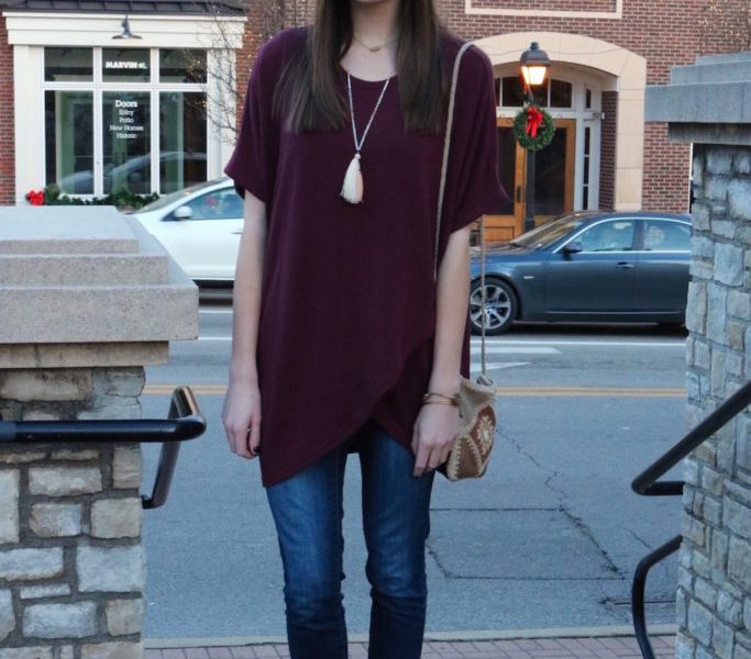 To achieve this look, I paired a simple pair of jeans with a tunic. I love deep tones, such as the maroon of my tunic, because my accessories can truly stand out. The simplicity of this outfit also gives me the freedom to dress it up or down, depending on my agenda for the day. For my shoes, I decided on a simple pair of brown suede booties. These are extremely comfortable, which is especially important if I am running around town on my feet all day. My jewelry of choice includes two layered necklaces, one long tassel necklace and one simple short necklace, and a stack of gold bracelets. This look is awesome because it can take me from breakfast to dinner and anywhere in between without having to change a thing.