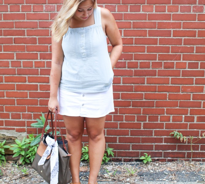 For my skirt, I went for an equally light colored item and wore my white button-down skirt. This piece can be worn for a lot of different occasions. The cotton fabric is so comfy that I would consider wearing it to class or a nice dinner out. The combination of these two items is reminiscent of a romper which is why I found it so easy to walk around in if you were traveling a lot this summer.
