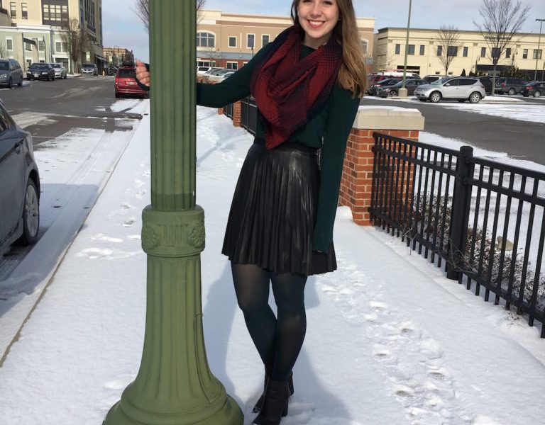For this look, I paired a black, faux leather, pleated skirt with a dark green, long sleeve blouse. I threw on some taller black booties and a plaid blanket scarf to keep me warm. I put some dark green tights on to pull the look together. I would wear this outfit for a girl’s day or dinner with the family.