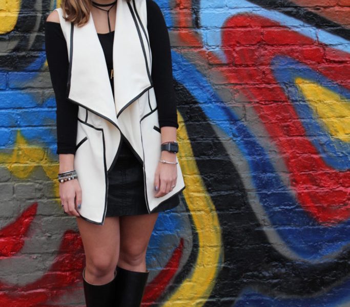 For this fun look, I paired some basic pieces together to make an outfit that is anything but basic. This black off-the-shoulder top is very versatile and perfect for layering. I decided to wear one of my favorite articles of clothing: my leather skirt. My black leather boots helped make the outfit a little more casual, but could be swapped for some black heeled booties to dress it up.