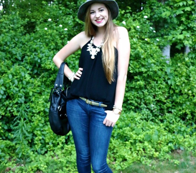 My personal style is very much inspired by my fashion icon Blake Lively. Like her, my style is classy and chic with unique takes on popular looks. As shown, I love to accessorize the timeless color black with chunky, sparkly jewelry that really makes a statement. You’ll almost never see me out without a Michael Kors watch and a wrist full of bangles and bracelets. I also don’t limit jeans to any season, as I love to wear dark wash Citizens of Humanity denim all year round! Here, I chose to pair my jeans with snake skin wedges to dress up my look.