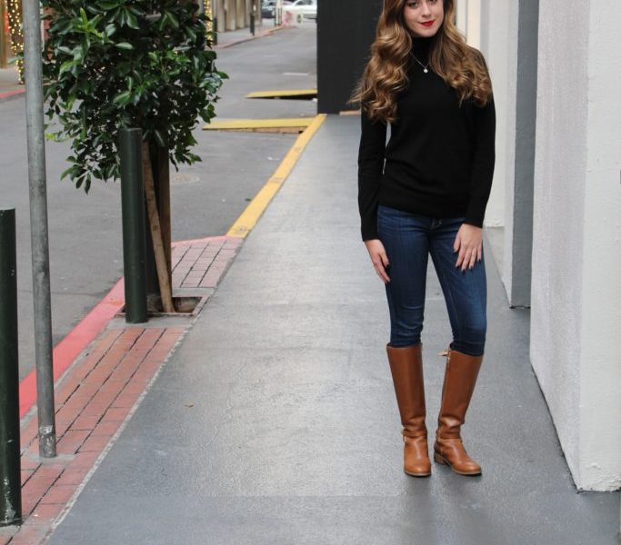 This outfit is sleek and classic and something I wear when walking around a city, shopping, and exploring. The black turtleneck is a new favorite of mine, I love black and this light weight sweater is perfect for the beginning of cooler weather! I paired it with dark wash denim that is fitted and casual enough to walk around for hours. To finish off this simple outfit I added some luggage-toned boots. Hope you all have enjoyed this article and enjoy your semester!
