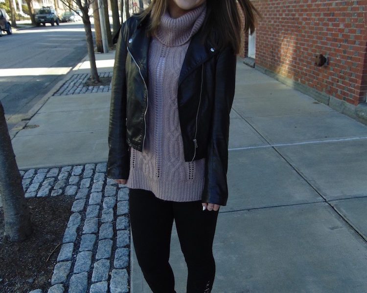 For this outfit, I decided to start with one of my winter essentials, a turtleneck. From there I layered on a leather jacket and accessorized with a watch. My favorite part about this look is the pants. Although they have the appearance of black jeans, they have the comfort of leggings with an additional lace detailing. I think this detailing makes the outfit unique and a good reason to take a second glance. This look would be great for a day of shopping or grabbing lunch with some friends. As long as it’s comfortable and cute, your options are limitless!