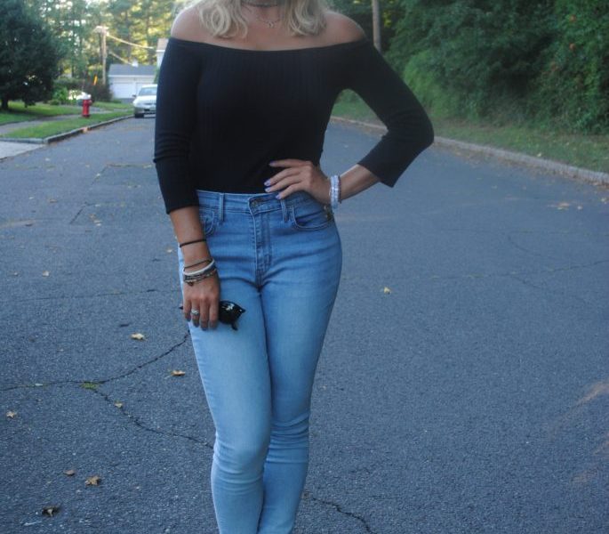 The outfit I’m sporting follows this plan to a T. Embracing the soon-to-come fall weather, I’m wearing a pair of high-waisted Levi Brand Jeans. These will be perfect for any fall outing. Whether I’m tailgating a football game, heading to class or wandering the streets of New York City, these jeans are comfortable and versatile enough for doing almost anything. Holding on to every last bit of warm weather, I’m wearing an off-the-shoulder top. Its snug, sweater material will keep my top half warm while my shoulders are out to play. I’m also wearing a pair of white, leather sneakers for some added contrast and comfort to my outfit. Lastly, I never leave the house without my Ray-Bans sunglasses or my beloved arm candy and necklaces.