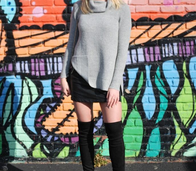 I believe that with a fresh manicure and a fabulous outfit anything is possible! My personal style varies anywhere from athleisure to boho-chic to modern contemporary depending on the day. My ultimate love is for shoes, which is fitting being that I have worked at Steve Madden for the last two years! Like my look here? This is a simplistic, modern chic look that is perfect for work or a night out on the town. It’s a cozy turtleneck sweater with slits down the sides paired with a leather mini skirt and black suede over-the-knee boots.
