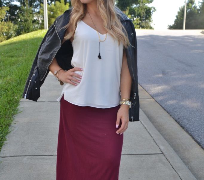 In the latest issue of StyleWatch, New York City blogger, Christie Ferrari  draped her moto jacket over a maxi dress so that is where I found the inspiration for this look. I decided to pair my black moto jacket with a simple white tank, black flats and a burgundy maxi skirt. (P.S. I’m loving that burgundy is a trending fall color!) I accessorized this look with a black fedora, Gorjana tassel necklace, gold arm candy and topped it off with a nude lip and rose-toned smoky eye.