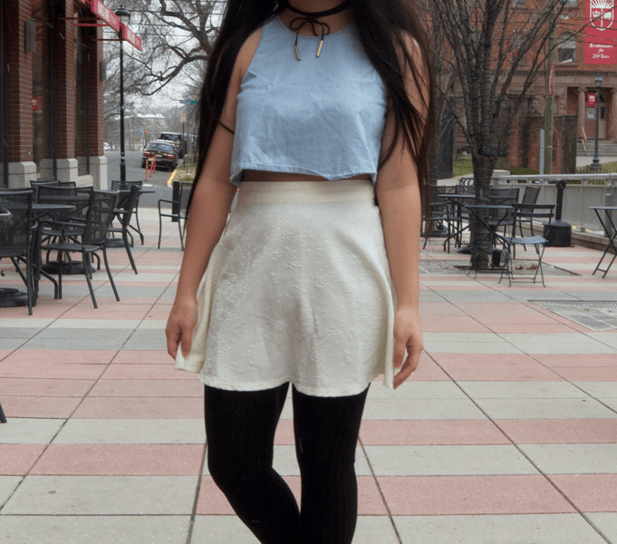 For this look, I started with piecing the denim crop top and white, floral skater skirt together. To dress it down a bit, I threw a cardigan over it (if you’re ever feeling too dressed up, an oversized cardigan can usually do the trick to making your outfit more casual). Since it’s winter, I went with black tights and a pair of faux leather, heeled booties to finish it off. As for my bag of choice, it’s almost always a backpack. I probably have more backpacks than the average person. My go-to is my brick colored Fjallraven, but here I am sporting a blue, faux leather backpack to add a pop of color and complement the denim top. Bonus: it has a zippered pocket on the back! When I first saw this bag, I thought it was unique and functional so I had to have it.