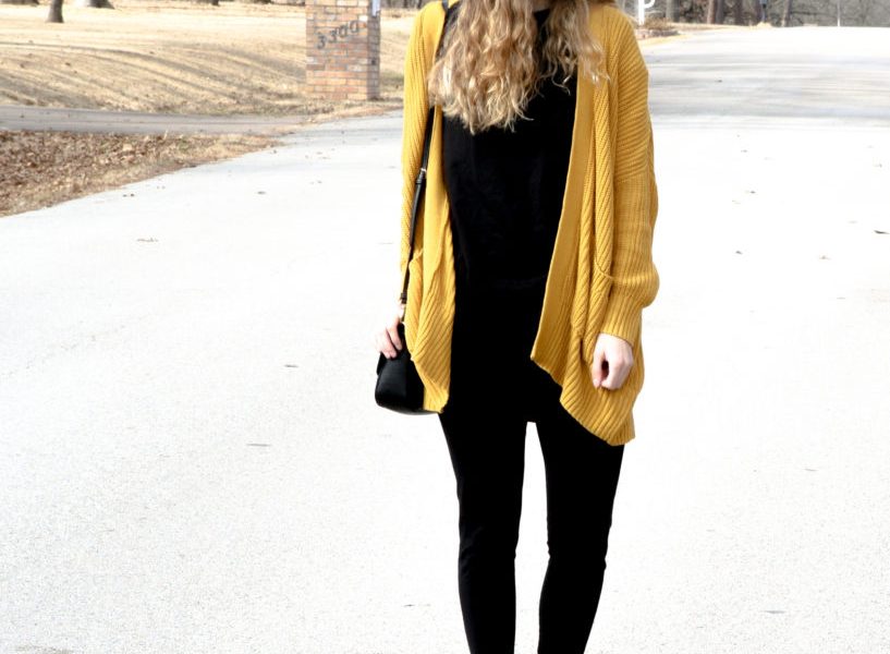 I decided to showcase my everyday style in these photos. I’m wearing a basic, long black shirt, black leggings, Adidas, a large mustard yellow cardigan, and a black purse. Large pullover cardigans like this one are perfect for windy days in Texas where it’s not too hot but not too cold. A good basic shirt underneath is good as well because anything with a pattern or texture would not match with this kind of cardigan.