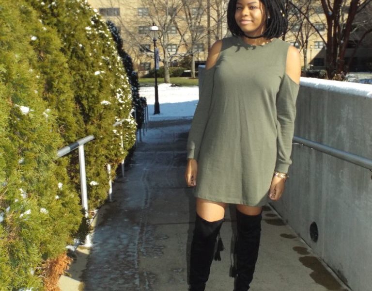 I have yet to pinpoint my particular style, but I love to buy essential, staple pieces to go in my closet and go from there on how to style them. I mostly get my inspiration from Rihanna, Khloe Kardashian, and Zendaya. I’m also strongly obsessed with going on YouTube for lookbook inspiration from my favorite creators: Nazanin Kavari, Jayla Koriyan, and GlamTwinz334. I’m not going to lie, I love living in leggings, throwing on my Superstars, and my oversize denim jacket. But, there are days when I want to pop out and put more effort into what I wear, which seems to be more or less every day. For this outfit, I’m wearing an olive green cold shoulder dress, black over-the-knee boots, and some gold accessories to complete the look. I also love to dress in colors and tones that complement your skin tone, so throughout shopping I’ve found gold jewelry looks best on my warm skin and found the right tones of specific colors for my clothes.