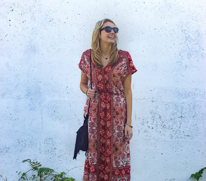 You can usually find me in pieces that are casual but paired with my favorite jewelry to bring the look together. This is represented in my outfit above where I went with this amazing maxi dress (in a different color here) that was not only on sale but also comfortable and has pockets! Since this is such a stand out piece, I wanted to keep the accessories simple so I added some gold and black jewelry with these cute sandals and a fringe bag. Such a good outfit to end the summer with!