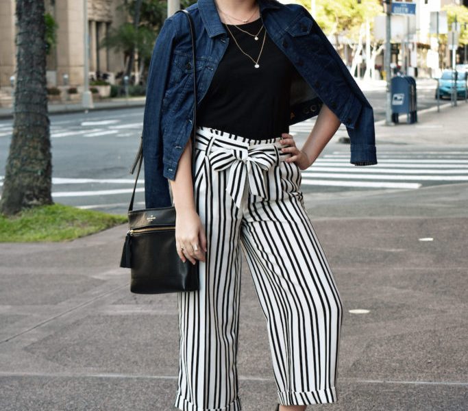 My outfit is inspired by pieces I had in my wardrobe when I was younger. I have always had a classic denim jacket, and I think it should be a staple in anyone’s wardrobe. Underneath the jacket, I paired a simple black T-shirt with some dainty layered necklaces to balance out my striped culottes which are the focal point of this look. A statement piece like these striped culottes will definitely turn heads! I love how the vertical stripes and flared bottoms elongate my legs and give the illusion of height. The bow belt detailing on the pants also adds a cute flair to the outfit. I completed this look with my black leather Chelsea boots and a black leather crossbody bag.