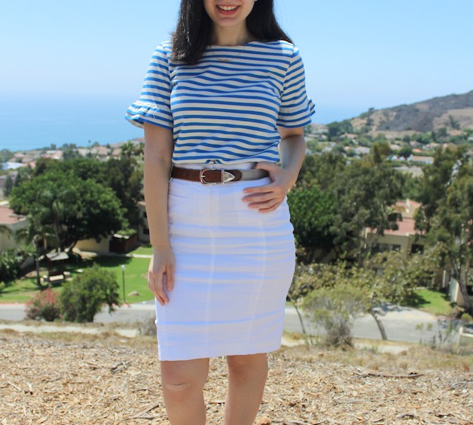 Differing from the cloudy canvas of London, I see many sunny days in Malibu. This change has caused my outfit choices to reflect the bright hues of the ocean and other colors around me. Therefore, do not be surprised if you see me around campus (or online) in blue and white striped tops. I love this one because the ruffles on the sleeves give the traditional striped tee shirt a makeover. Who says conventional cannot be shifted to innovational?