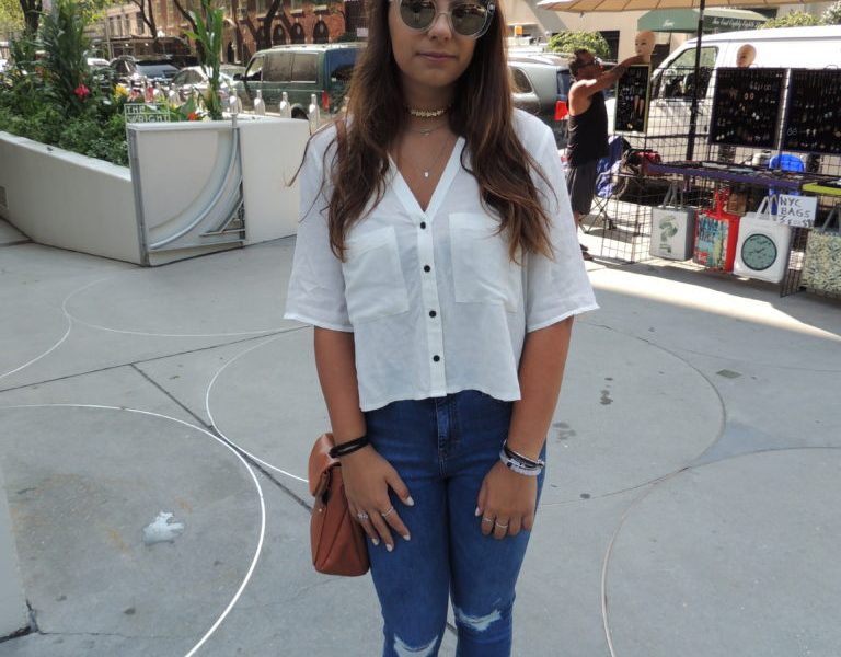 My outfit consists of a white blouse with a navy blue lace bralette underneath. The light layered on top of the dark gives some added detail. This is paired with blue jeans that have slits in the knees and brown strappy sandals. I’m wearing my favorite choker, which is made up of gold stars.