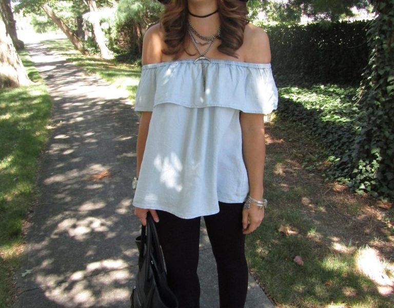 I like to think that my style is so unique it can’t be categorized, but I don’t think I’m that cool, so if I had to put a label on my style, I’d say I’m somewhere along the lines of preppy and trendy (although, I do like to shake it up when I can). The trendy side of my style is definitely showing in this article. I wore a chambray off-the-shoulder top, black jeans and black lace-up heels. Since accessories are vital for any outfit, I topped off the look with a black sunhat, my black structured bag and oodles of silver jewelry!