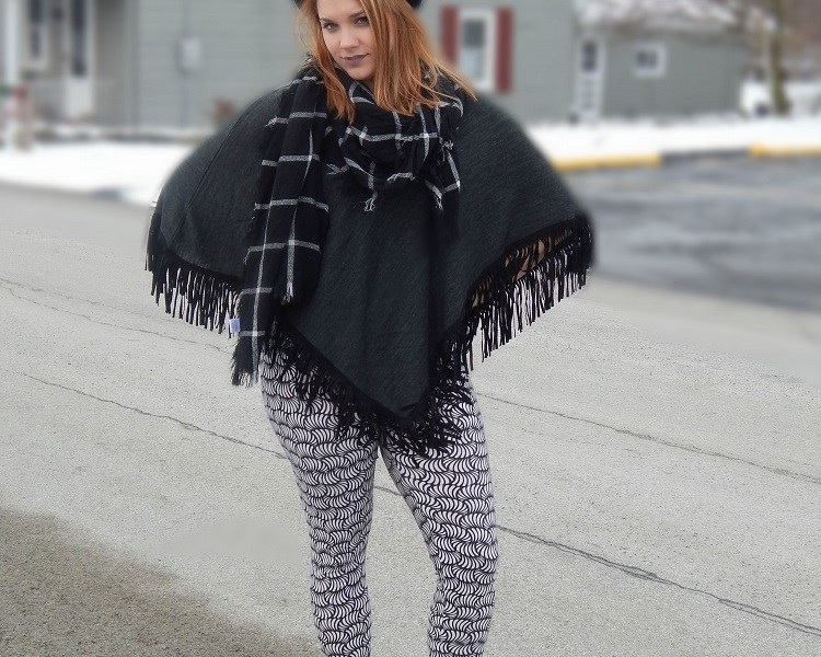 In this article, I’m wearing a fringed charcoal gray poncho with black and white patterned leggings, a black and white plaid scarf, white high-top Converse shoes, and I topped off the look with a black bowler hat.