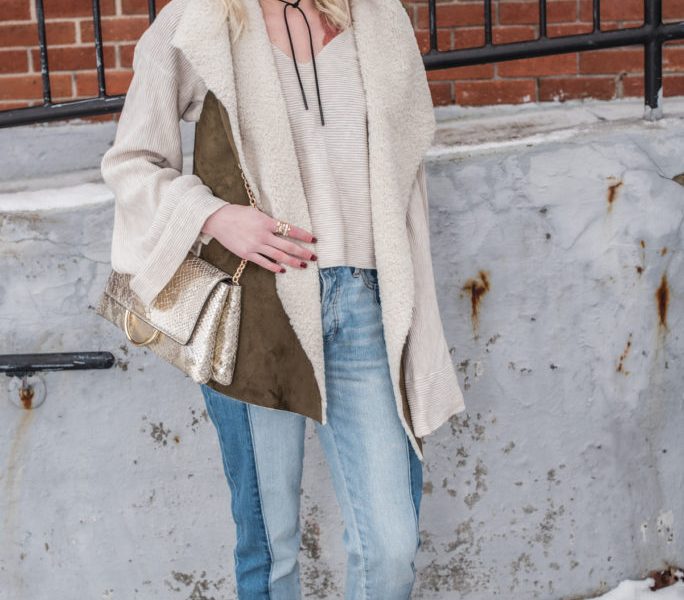 For this look I channeled my inner ’70s vibes and incorporated a bell-sleeved top from Free People since it is in fact one of my favorite stores! I decided to put a suede vest over it which you can never go wrong with… cute and heat effective for Buffalo weather! I paired this top with a pair of high-waisted two-tone jeans and leather boots. In my opinion leather boots are a fashion staple that every Fashionista needs. To keep the outfit exciting, I always like to add a fun necklace (a bolo tie in this case) and a fun print! I decided to incorporate snakeskin with my purse.