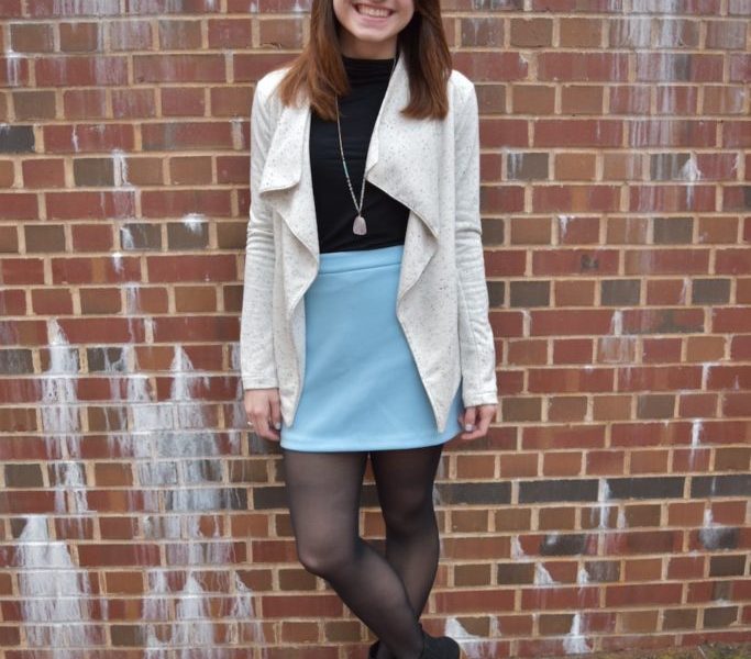 The look I chose to show here definitely exemplifies my more minimalistic taste. I paired a fun, baby blue mini skirt with a classic, fitted, black turtleneck. The gray and white speckled moto jacket style sweater added a touch of urban-chic to the look, and the flared edges of the jacket gave the look some dimension. To finish off the look, I threw on some black booties to tie together the overall minimalistic appeal. Balancing out multiple black aspects with a touch of color through the skirt and necklace is one of my favorite style methods.