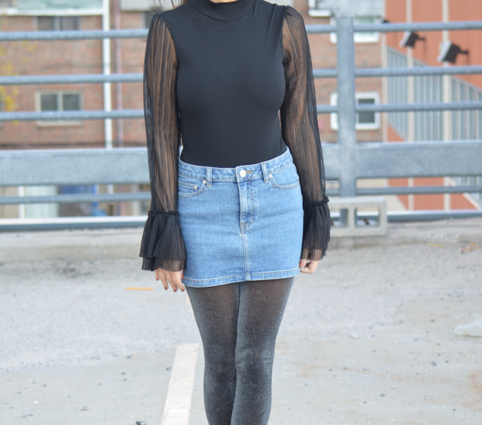 Having a love for fashion gives me the energy and need to wear nice clothes for a majority of the days. I mean I buy clothes to stay in style, be trendy, look cute, and because I am a shopaholic, so I might as well wear them. Along with dressing I love to accessorize. For me, accessorizing includes a scarf, purse, jewelry, shoes, and even a hat, in the colder months. For one of my dressier days of dressing for class I decided to wear a black leotard with wide sleeves to give my outfit a more dramatic look, I paired the leotard with a denim skirt, accessorized with metallic tights and finished it off with crushed velvet booties.