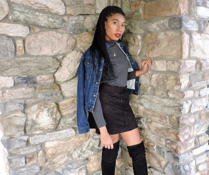 I am currently into mainstream street style fashion. I am investing in a lot of suede clothing as you can see from my pictures. My black suede skirt, along with my knee-high boots. Then over my gray turtleneck sweater, I added an extra large denim jacket. I personally liked incorporating this jacket for a more street style vibe because it really made this look my own.