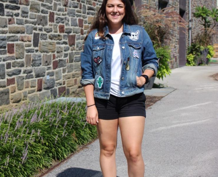 This outfit features my DIY of the summer, a denim jacket with iron on patches. Personal flair pieces, such as pins and patches, have been the trend of the summer and what better way to head back to school than with this statement making jacket. I carefully found patches that appealed to me in shape, color or size and gave an old denim jacket some new life. Paired with fashion sneakers and shorts, this look is perfect to catch up with friends for coffee in between class.