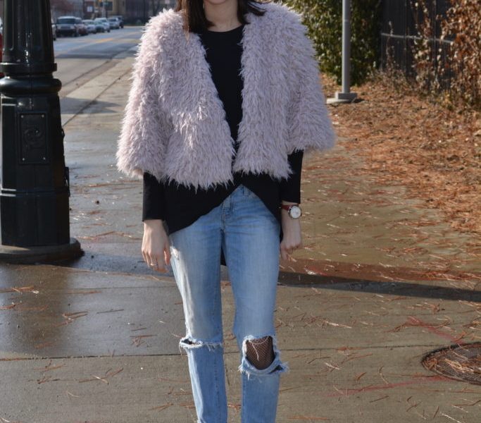 The outfit I am wearing here brings attention to my true obsession: shoes. Recently, I have found that statement shoes are my go-to because they can bring life to any outfit, even one as simple as jeans and a T-shirt. Here, I make my metallic platform oxfords the focal point. Platforms shoes are on the rise, and I can’t get enough of them. In this look I brought together some of my favorite looks of the season. I layered boyfriend jeans over fishnet tights with an asymmetric tunic on top, combining my feminine side with a little bit of a tomboy edge. I topped it off with a lilac faux fur jacket to add some color and also to make it wearable in this freezing Michigan weather. What I love most about this season’s trends is the concept of layering; it’s perfect for these next few winter months to go from frigid to fashionable within seconds by just taking off a layer.