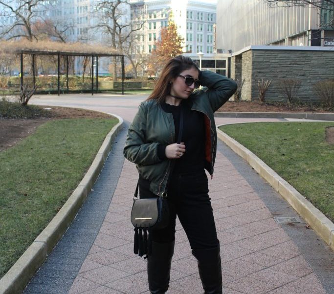 When it comes to my personal style, I like to describe it as trendy. I tend to base my style off of the newest or incoming trends. For instance, the outfit in my photos features some of my favorite trends, bomber jackets and chokers. Recently, I have become obsessed with over-the-knee boots so I decided to add those to my outfit as well. I love street style looks and I think this one really complemented the idea I was going for.