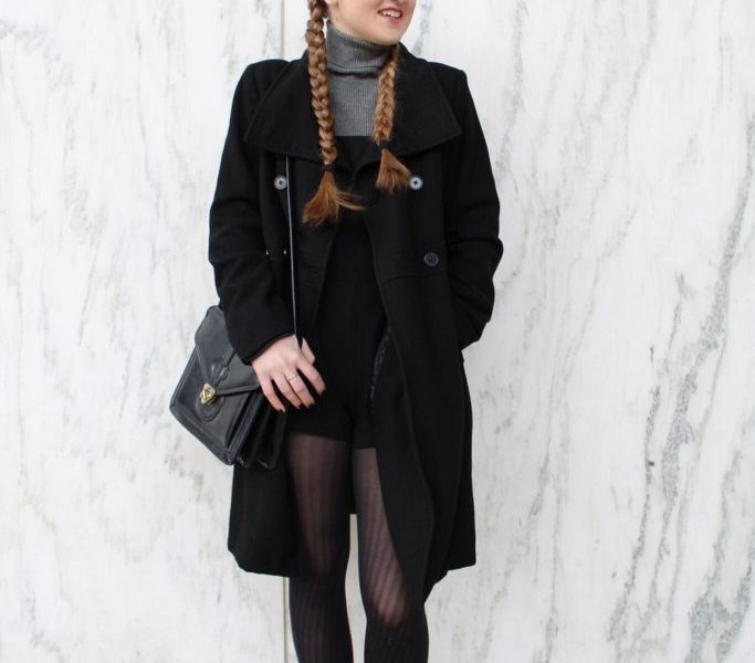 Speaking of thrifting, every item in this look was found at local thrift stores around my area. I have layered a fitted gray turtleneck and pinstripe tights under simple black overalls and a relaxed wool trench coat to stay warm while walking around campus. Some simple accessories such as a vintage Italian leather purse, a small black watch, and some casual heels make this outfit a perfect mix of trendy and timeless.