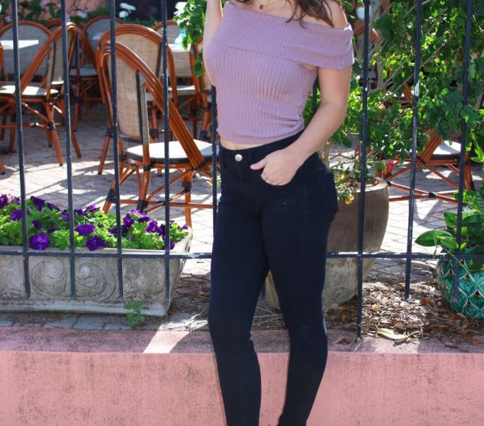 For this look I really wanted to go with something everyday, fun, but still a little edgy. I paired a mauve off-the-shoulder top with classic high wasted jeans and a simple princess length necklace. I’ve been super into minimal jewelry lately and feel as if one or two low key pieces alone can really complete a look! Having my hair out of my face showcased both the top and necklace for a simple yet sophisticated vibe. Half-up half-down ponytails have been my go-to. They’re super cute and can even turn a bad hair day around! I chose the mauve top for this look because it’s gorgeous on so many skin tones and hair colors, and you can never go wrong with black—ever. To dress it up a bit, and because I have a serious obsession, I finished the outfit with some suede cut-out booties.