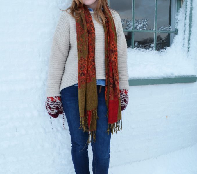 Winter is my absolute favorite season. I love bundling up with layers of warm clothing and piling on cute accessories to match. This look is my go to outfit for chilly winter days and can be easily recreated for your own wardrobe. I knit this textured mock neck pullover from a Brooklyn Tweed pattern using Quince & Co yarn. This Madewell Cocoon Mock Neck Sweater is a similar look, but just without all the extra time spent hand knitting. I love denim and I love denim on denim even more. I’ll usually pair jeans with a denim shirt in a different shade to add contrast. My simple, black leather booties are my favorite shoes I own; just the right height to still be able to walk across campus in and a sleek design that matches everything I own. To finish the look, I always throw on a scarf to add color and necessary warmth. I love bold, saturated colors, red being one of my favorites and I prefer them to be oversized so I can wrap them around my neck or let them hang straight.