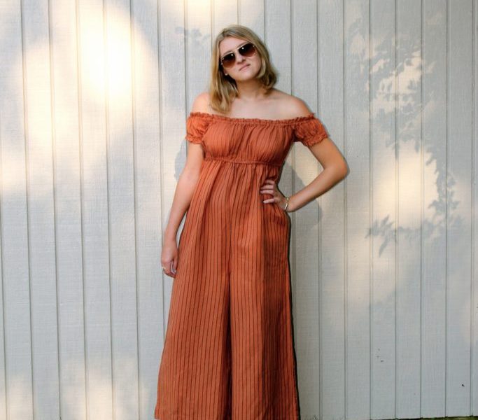 This outfit is great piece to go from summer to fall with! The light fabric and off the shoulder detail makes it a great piece for summer but then the very trendy culotte style pant and rust and blank stripes make it appropriate for fall! Being that it was still super hot out in August, I paired my Free People culotte jumpsuit with some great flatform wedges and my favorite Ray-Ban aviators.