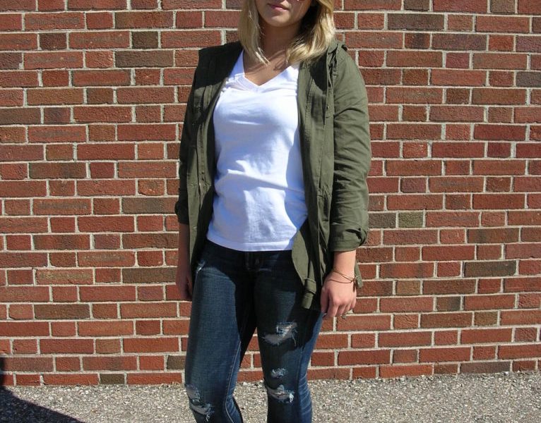 For this look, I decided to start with a plain white T-shirt paired with ripped American Eagle skinny jeans and a comfortable green jacket. For my shoes, I chose my Steve Madden black leather quilted slip ons that are great for walking around all day! And to top if off, I have my Jessica Simpson aviators and Alex and Ani bracelets that I adore.