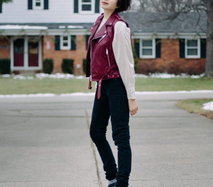 I was reading an article on Man Repeller about finding “your silhouette,” the go-to style that defines “you.” I took a serious look through my closet and found that mine is something of a throwback-gone-edgy look—like 18th century Romantic meets ’20s glam meets rocker chic. It makes sense, trust me. I might wear pieces from fashion’s past, but I’m also having a love affair with the glitter brow trend and a new ‘do. In the look pictures, I kind of conglomerated that, mixing a vintage blouse with a pair of high-waisted skinnies, socks ‘n’ strappy wedges, and, with ’80s being the next big thing, a punk-style moto vest in my fave maroon hue (shoutout to Who What Wear x Target).