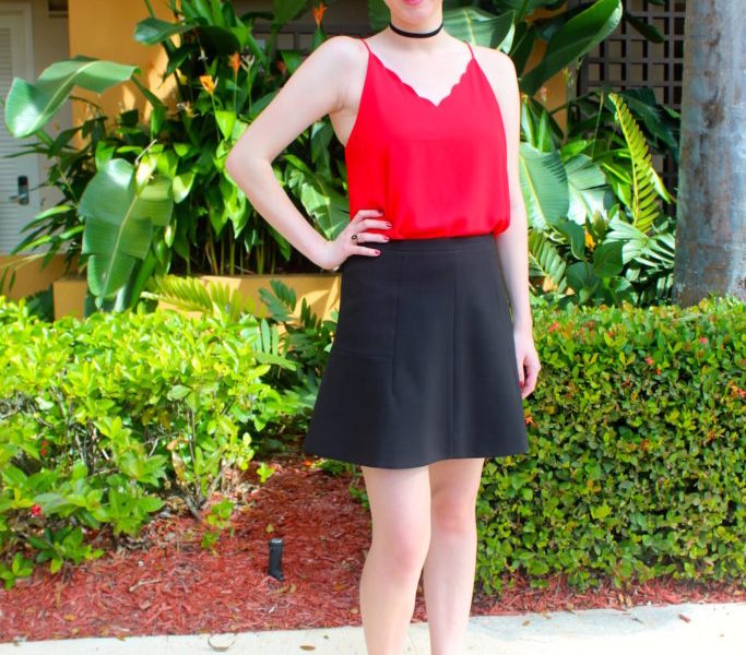 While on my tropical winter break vacation, I styled my outfit with minimal accessories and let the blouse do the talking. I paired my bright red blouse with a simple black circle skirt, black heels, a velvet choker and dainty silver stud earrings. Back home in the cold, I could easily wear this outfit with a few additions: tights, booties, and a chic leather jacket for warmth.