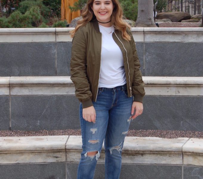 As for my personal style, I love to be trendy (of course) but being a college student that is always on the go, comfort is something important for my everyday style. Here I am wearing a pair of distressed jeans, a white T-shirt, and a green bomber jacket. A staple in my wardrobe is a good pair of sneakers. Whether I am wearing a casual dress or my favorite pair of jeans I am most likely styling it with a pair of sneakers. Here I am sporting my trusty pair of white high top Vans. I then paired this specific outfit with a simple black choker as well as this New York City skyline necklace. This a typical everyday outfit for me.