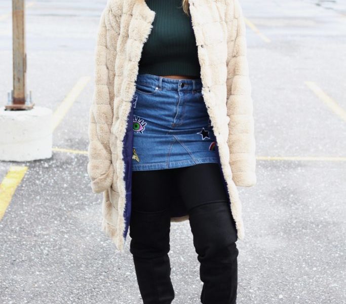 I decided to cook up a little something for my Fashionistas/os. So for this look, I took a forrest green long sleeved turtleneck, and wore it with black tights and a short embroidered denim skirt. I finished up my look with a pair of black over-the-knee boots, and threw on a reversible fur jacket. Who doesn’t love a bit of fur? It’s totally chic! I wore an oh so cozy toque since the weather is very cold in Guelph. Then, to complement my outfit I carried my gray purse.