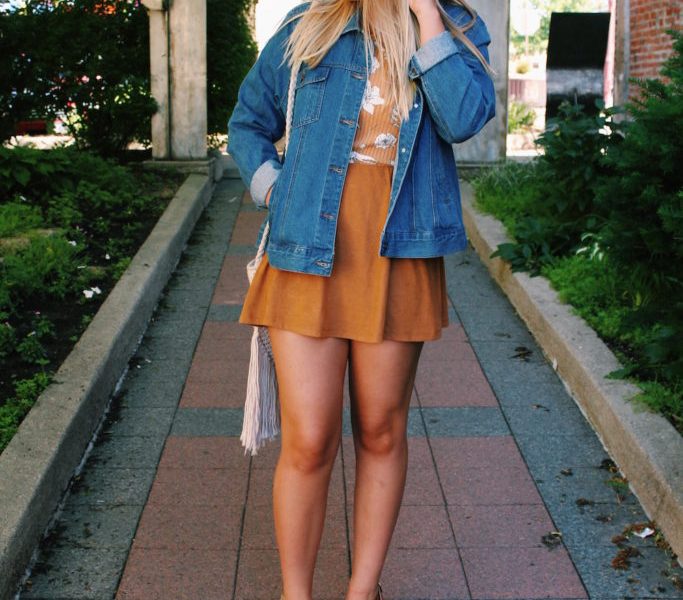 For this look, I combined some of my favorites into one outfit. I’m wearing a rustic orange suede skirt from Forever 21 with a lighter orange floral halter-top from Pacsun. I love mixing shades of colors with different details. I paired by outfit with a blue denim jacket to add color from the other side of the spectrum.