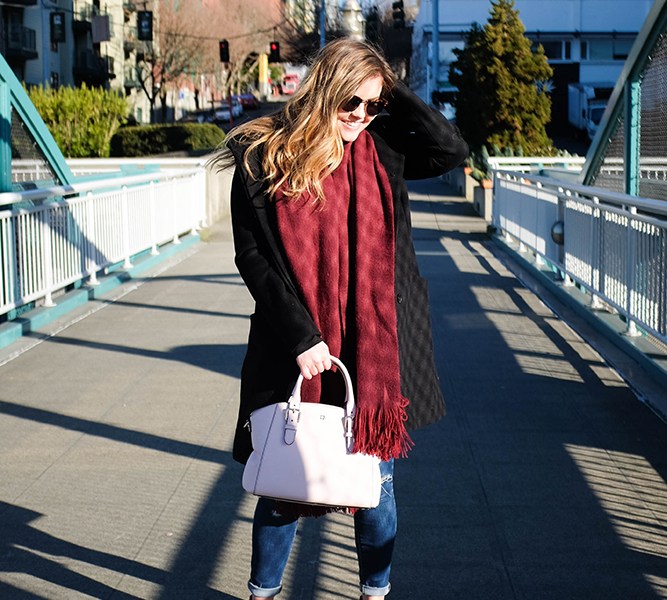 This outfit is a reflection of that. Washington is definitely having one of its colder winters, and investing in a nice warm wool or wool blend coat is a must. The one I am wearing in the photos above is a bit dressier, and to make a more casual look I paired it with my go-to ripped skinny jeans and a black thermal top. I am currently in love with this burgundy/maroon color and was ecstatic when I found both boots and a scarf in it. The deep colors really remind me of fall and winter, and the scarf definitely helped to block the wind.