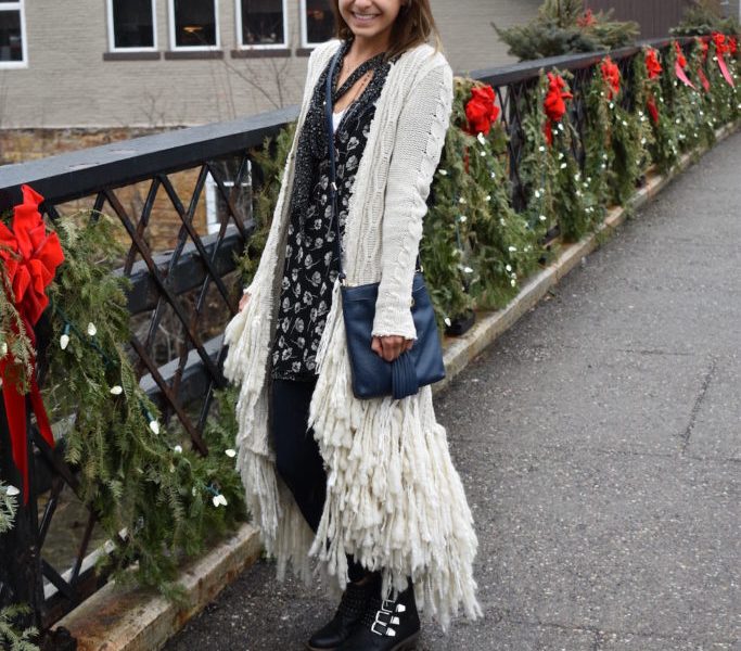 In this look I am wearing a silk blouse with a tie accent, leggings, an oversized sweater, and ankle boots. I finished the look off with a long, delicate necklace and my favorite crossbody bag! This outfit is effortless and perfect for a fun day out with friends!
