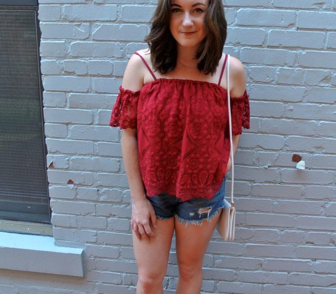 I am straight up obsessed with every article of clothing I am wearing in this outfit! The off-the-shoulder and cold shoulder trends are my absolute jam right now. This fun and flirty top is actually from Abercrombie & Fitch and you can find one like it right here. I love that this top can be dressed up for a night on the town or dressed down for walking class. Since I was unfortunately partaking in the latter activity, I chose to pair it with my favorite Free People ripped jean shorts, Steve Madden booties, and this adorable emoji-eyed cross-body that I found at a local Bloomington boutique.