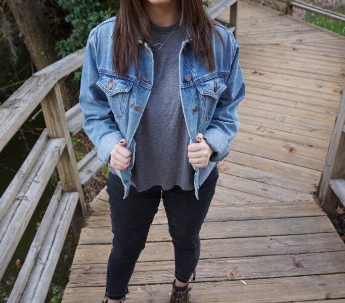 Here, I am wearing an embroidered denim jacket from Urban Outfitters, a piece that has become a staple in my wardrobe. I decided to pair the jacket with a gray mock neck top from Nordstrom and black frayed hem jeans from the Gap. Ankle boots have been a go-to in my closet ever since I moved to Tallahassee, where cold weather comes and goes in the blink of an eye. The gold buckles and cut outs give these Jeffrey Campbell booties give the outfit an edgier vibe. I accessorized with my favorite gold initial necklace that seems to be the perfect addition to all of my outfits.