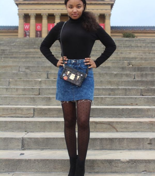For this look, I paired a dark wash denim mini skirt with a black turtleneck. I took the pictures above the other day when it was surprisingly 60 degrees in Philly. I figured a mini skirt was perfect for the weather and the turtleneck work great because it replaced my coat. For some extra spice, I wore sheer tights with small polka dots, black suede heel ankle booties, and a small box black clutch from my women’s accessory business which is perfect fit for a day in the city!