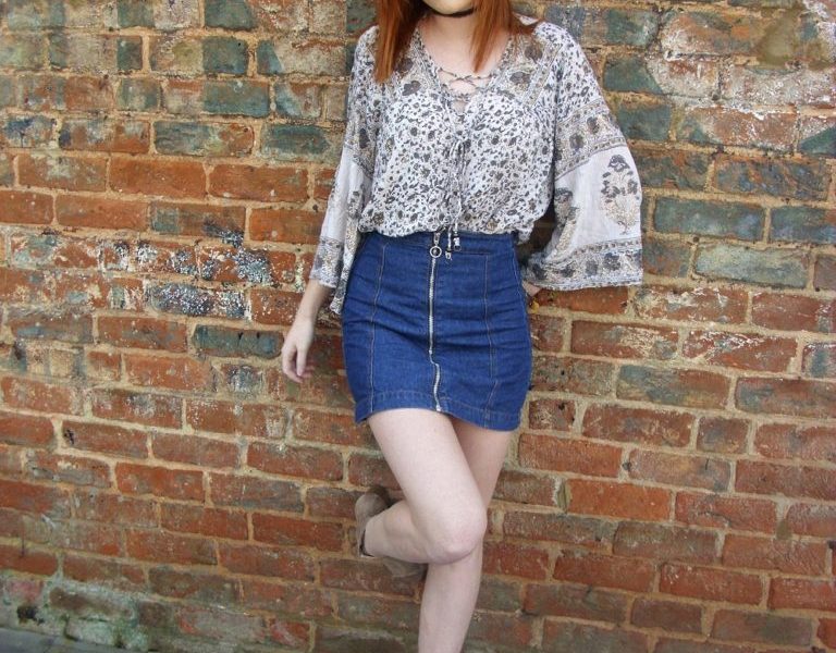 My personal style has definitely changed with the trends throughout the years, but right now I would say I’m taking a liking to ’90s grunge. Of course, the only way to turn a trend into a style is by adding your own twist to the outfit. The flared sleeves of this vintage top added a much needed boho, feel-good vibe to the grunge look. I can’t help but emphasize how obsessed I have been with the comeback of the denim skirt—seriously it has been such a refreshing addition to my wardrobe. My open-toed heels are definitely reflective of the December climate I’m used to in Florida. Obviously I finish out the look with a lace choker from Express and my favorite pearl earrings. I get a nice laugh in every time my younger brother says I look “emo” with a choker on.
