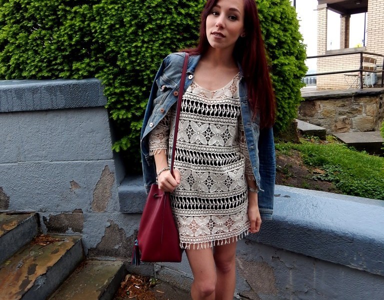 My style is always changing, one week I can be found wearing all black with thick eyeliner and the next week I’m rocking a Boho look with a seemingly fresh face. Since summer is quickly approaching I find myself drawn to a more natural, yet stylish look. This light and airy crochet dress paired with black mules helped me achieve a simple, yet chic outfit. I paired this outfit with a jean jacket, just in case a light summer breeze decided to blow through.