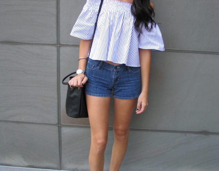 My style jumps around a lot, but it mainly consists of bohemian-chic pieces. I love playing around with all kinds of trends, as you can see here with my off-the-shoulder top—a huge trend this summer. I paired this top with some denim shorts and heels. I topped it off with a bucket bag. I really like wearing durable outfits that are comfortable for anything I have planned in my day. While this outfit was perfect for a brunch date with my friends, it was also lightweight and comfortable for the rest of my hot summer day!