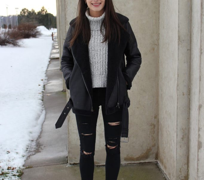 This look has been a staple for me this winter. My winter jacket is a much less expensive dupe of a super popular Acne Studios one, but it is so cozy and very high quality. I paired it with my go-to black distressed jeans to add a little texture to the look. All of my staple sweaters in the wintertime tend to be a neutral color because they go with everything. I threw on a pair of black suede booties to elevate the look. This outfit is perfect if you’re running out the door to a coffee date or class.