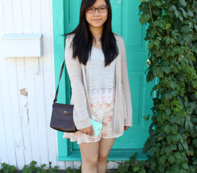 For this summer, I chose a more feminine and neutral tone style to show that I am a humble student intern. I started my outfit wearing a light gray crochet-trimmed tank and a cherry blossom floral print skort, both from Forever 21. The two neutral colors match perfectly, and the splice crochet blends the two colors well and provides an interesting detail. The light pink cherry blossom on the skort is one of my favorite prints from my wardrobe, as it reminds me of spring in Tokyo, and the pink color adds a little bit of warm vibe and uniqueness to the neutral look.