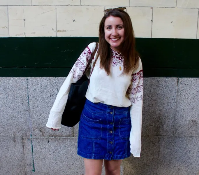 Early fall in London has been pretty mild thus far, so I took the opportunity to wear my favorite jean skirt! Just as London is a mix of styles, full of rockers, polished preps and edgily chic dressers, I decided to mix styles in my look.  In order to do this, I chose my slightly rugged ’90s inspired bright blue wash, button-up Free People jean skirt.  This skirt is so versatile, and can transition from early to late fall with just the addition of some black tights and your favorite pair of booties.  I decided to mix this slightly edgy yet cute look with my romantic blouse, similar to the one with the link provided; it’s cute and visually interesting, with detailed red embroidery on the neckline and upper sleeves.  I kept the shoes polished and simple, yet a little edgy, which nude, gold-studded flats.  My bag remains with the polished yet edgy look, and is sure to bring me from the Tube, to the markets, to the wonderful Oxford Street shopping seamlessly.  With tons of room for my camera, wallet, shades and anything else I would need, it is truly a simple and chic everything bag, maintaining a crisp European flare that is sure to blend with any look.  I can quickly transition this look for class by simply throwing my textbooks in my bag, studying in style! With this look, an appetite and a few friends to join me, I’m ready to experience all that the markets have to offer!